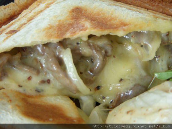 ▼黑胡椒牛肉起司布朗-將兩片吐司結合成一個薄薄的方形包,中間填入了起司以及牛柳。 外皮吐司稍嫌脆度不足,我個人是覺得裡面如果改塞冰淇淋的話,或許會成為一道美味的甜點。 餐點附飲料。
