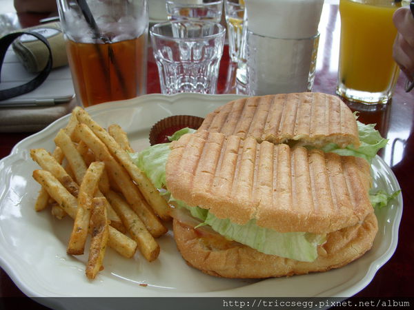 ▼燻雞帕尼尼-炭烤三明治的外皮非常像大型洋芋片,做法是將圓形麵包壓扁之後烘烤而成,酥酥脆脆的口感不錯,內餡則是富含水分的脆葉生菜與燻雞。 旁邊的薯條雖然是配角,不過不錯吃喔。 餐點附飲料。