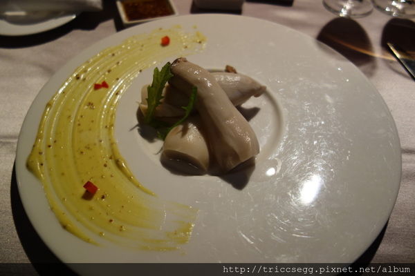 ▼法式杏鮑菇沙拉-點選時服務生有特別提醒口感偏清淡,吃起來的確如此。 大塊水煮的杏鮑菇軟嫩多汁,可沾黃芥末、油醋蒜醬一齊食用。 個人認為黃芥末甜中帶辣,味道較搭;油醋蒜醬則是滋味有,但無法滲入菇中。