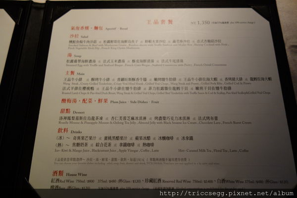 ▼菜單-餐點皆為套餐,一套1350元+10%服務費。 每套餐包含:麵包、沙拉、湯、主餐、鮮果、甜點、飲料,以及酸梅湯、氣泡香檳...等餐間飲品,每個項目皆有4個不等的選擇。